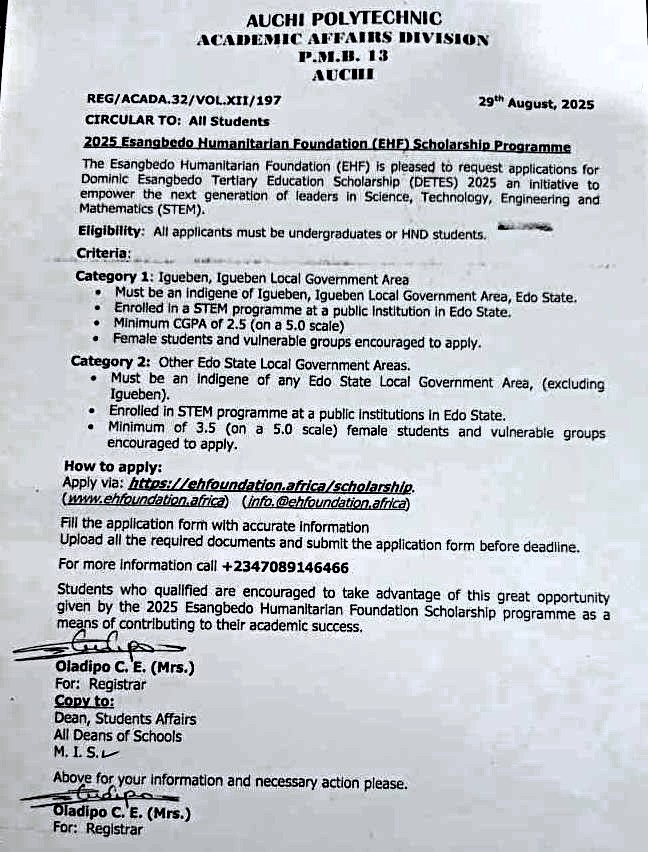 The Esangbedo Humanitarian Foundation (EHF) Scholarship Programme is pleased to request application Tertiary Education Scholarship 2025, an initiative to empower the next generation of leaders in Science, Technology, Engineering & Mathematics (STEM).